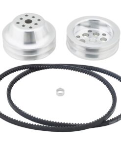 - Kit includes a cast aluminum double groove water pump pulley and double groove crank pulley, and a matched pair of heavy-duty belts. Has a 1:1 water pump/crankshaft speed ratio.